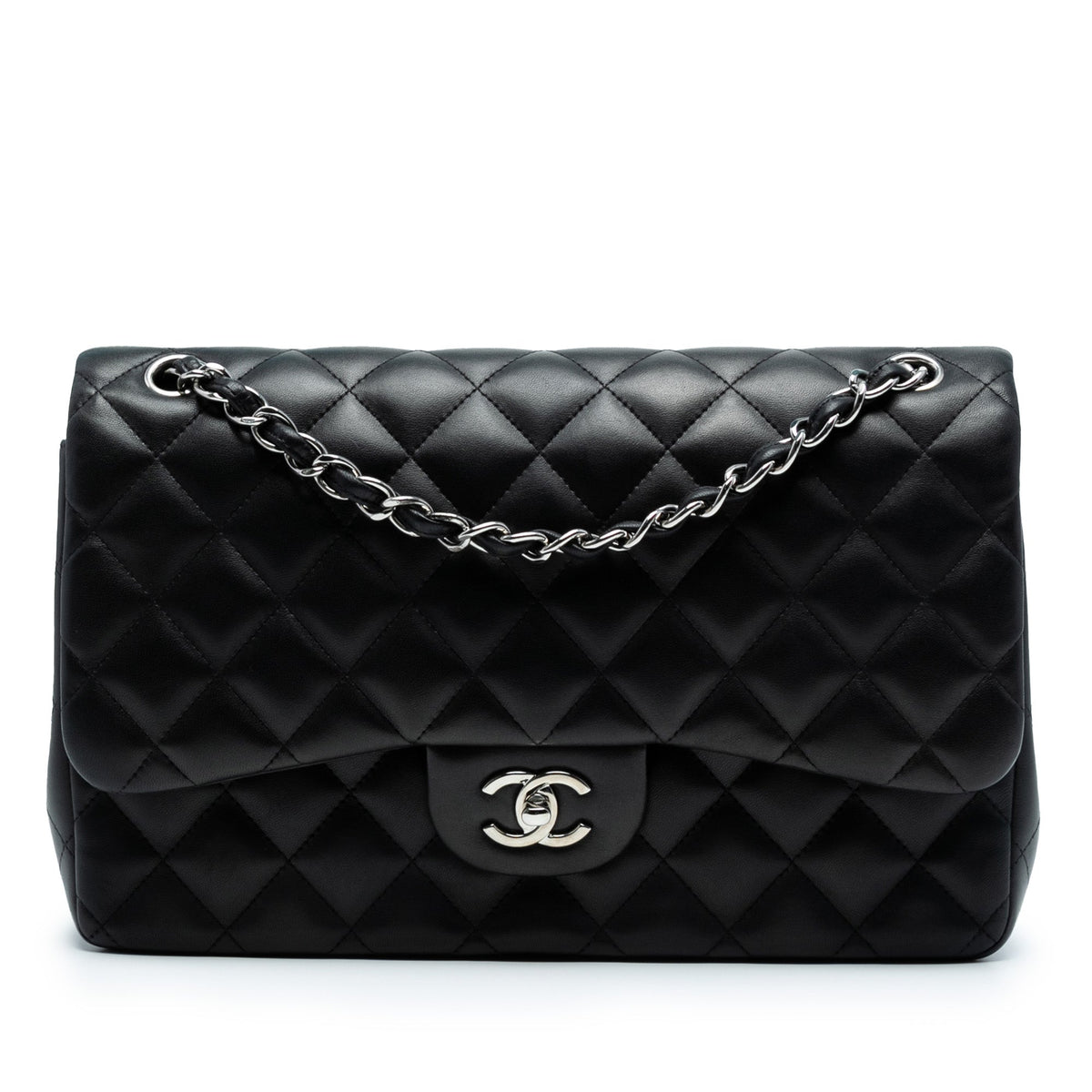 This version is crafted in black lambskin, loved for its structure and incredible durability, and finished with silver-tone hardware and the signature leather-woven chain. The Jumbo size offers a beautifully roomy interior, making it the perfect everyday luxury bag — elegant yet practical.