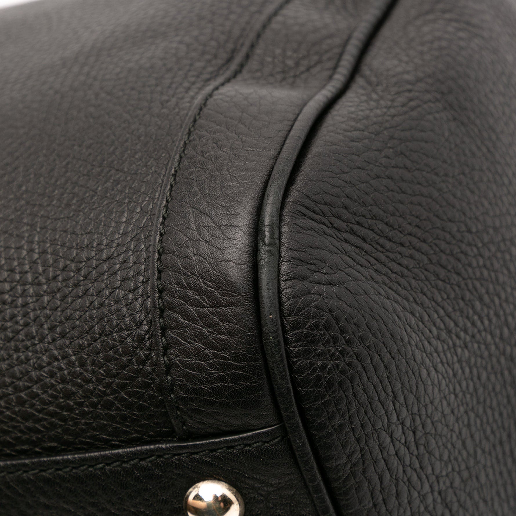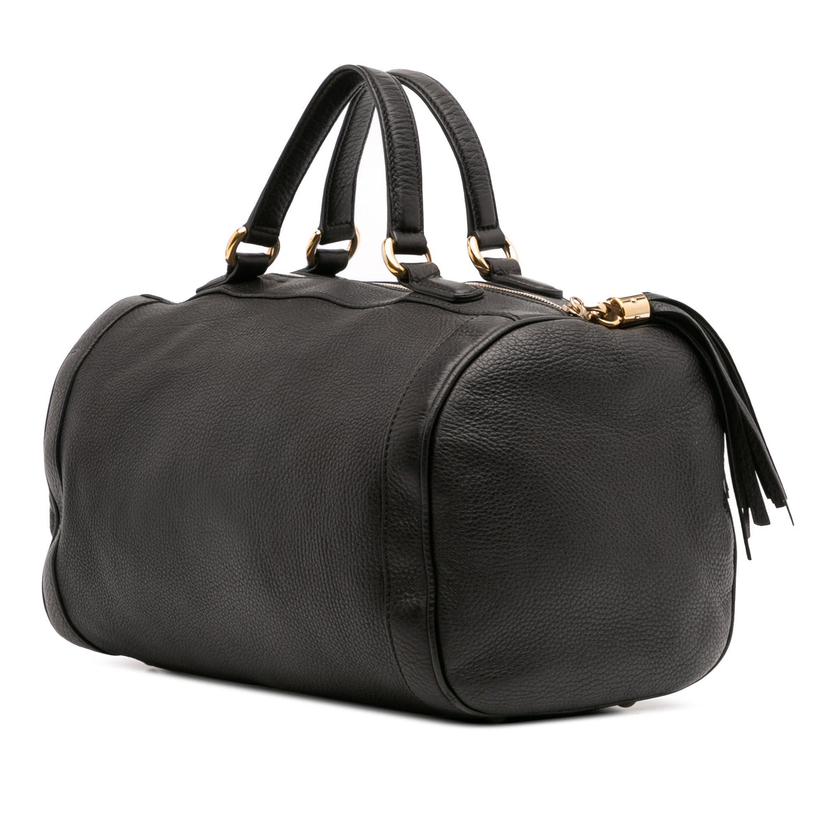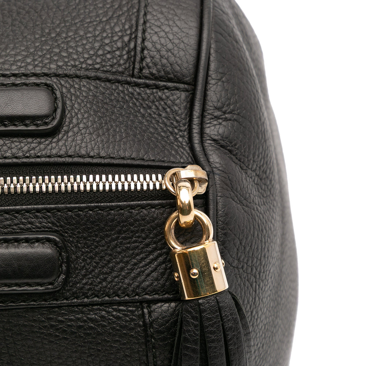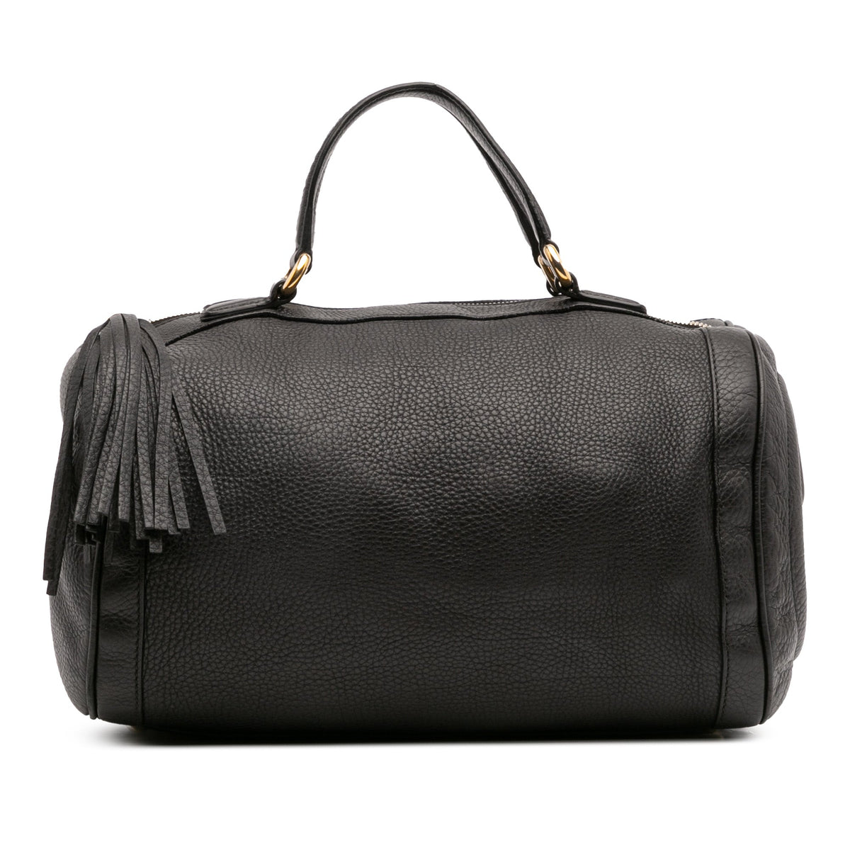 The Gucci Soho Boston Bag is a modern icon — a softly structured top-handle bag crafted in luxurious pebbled black leather, finished with the signature interlocking GG and the line’s distinctive leather tassel zip pull.