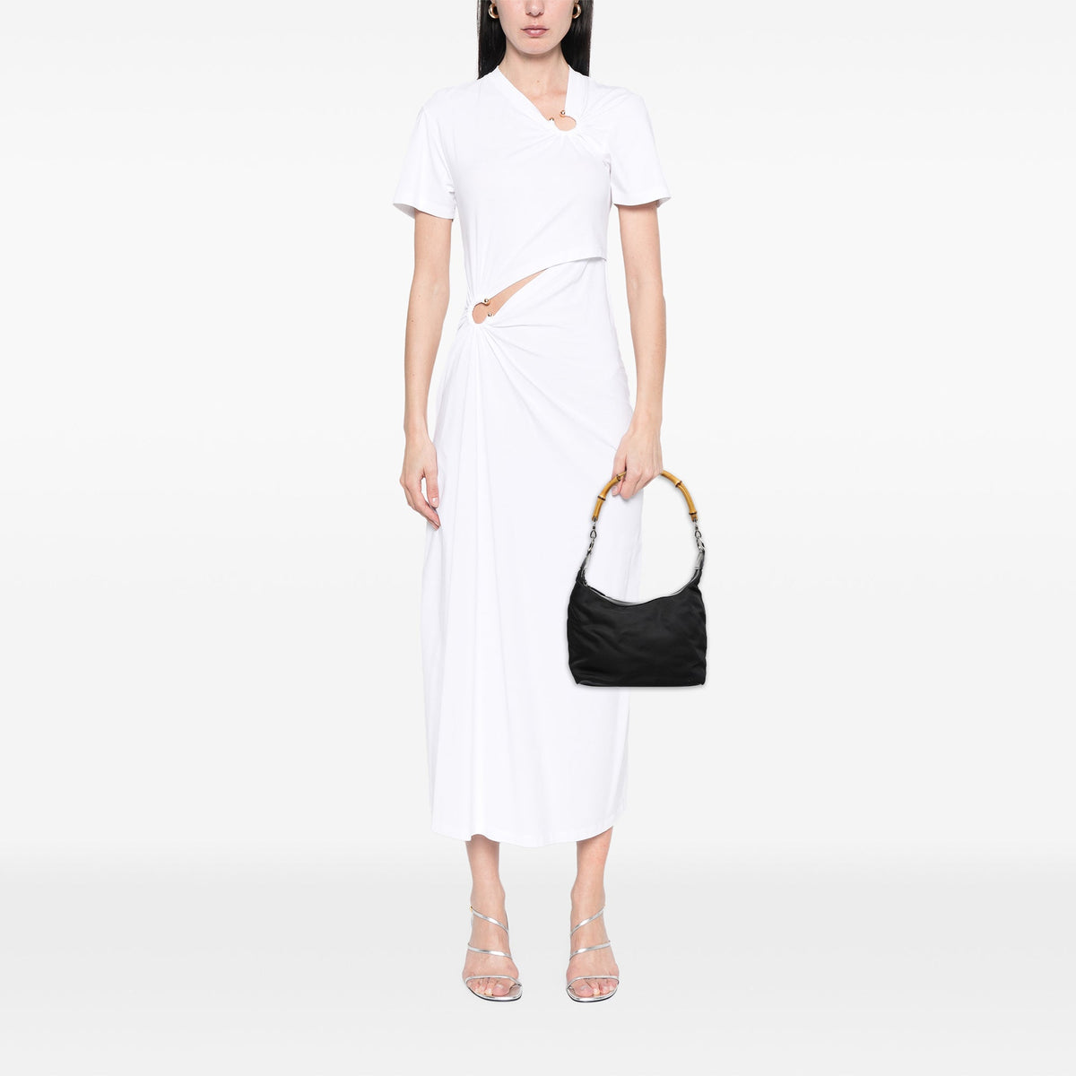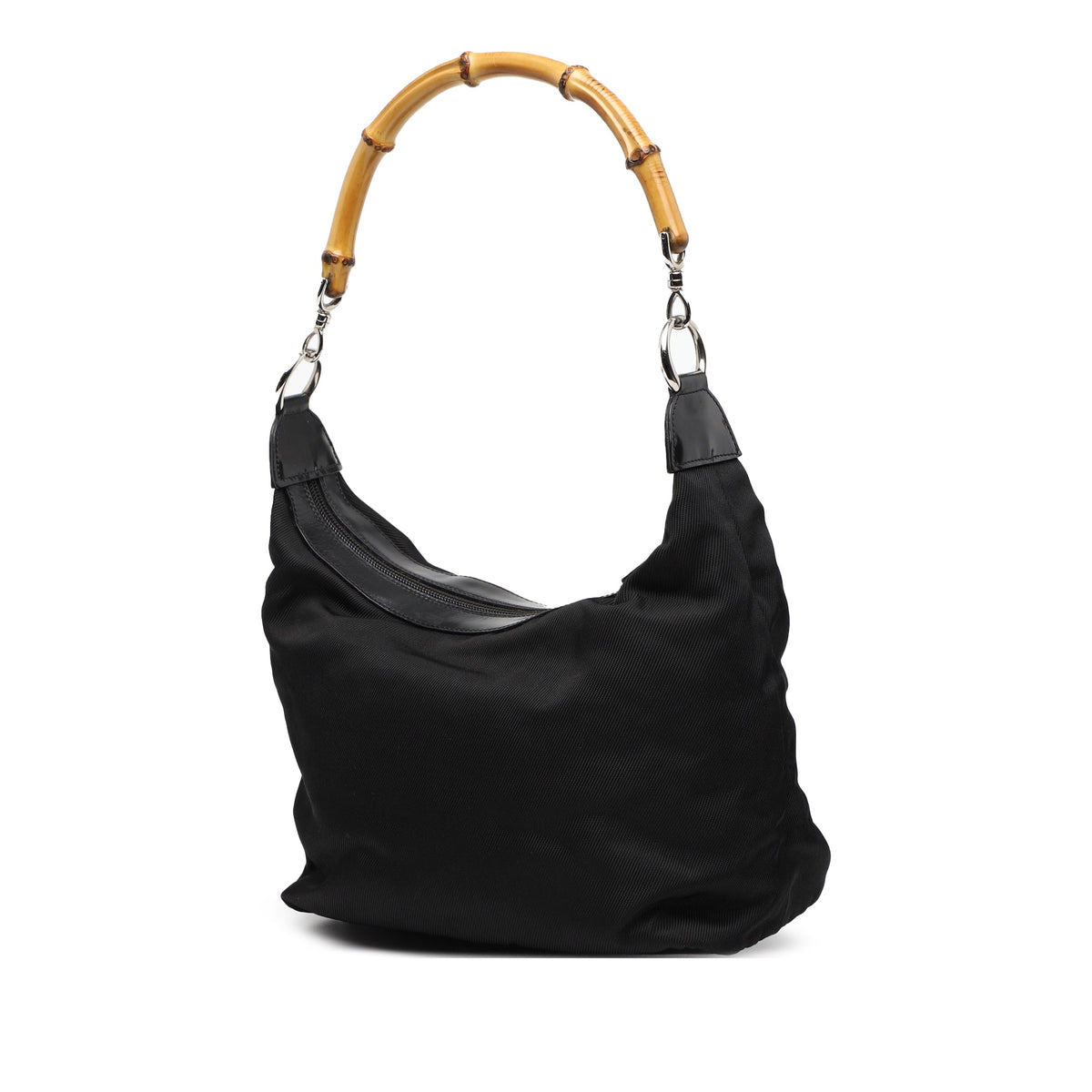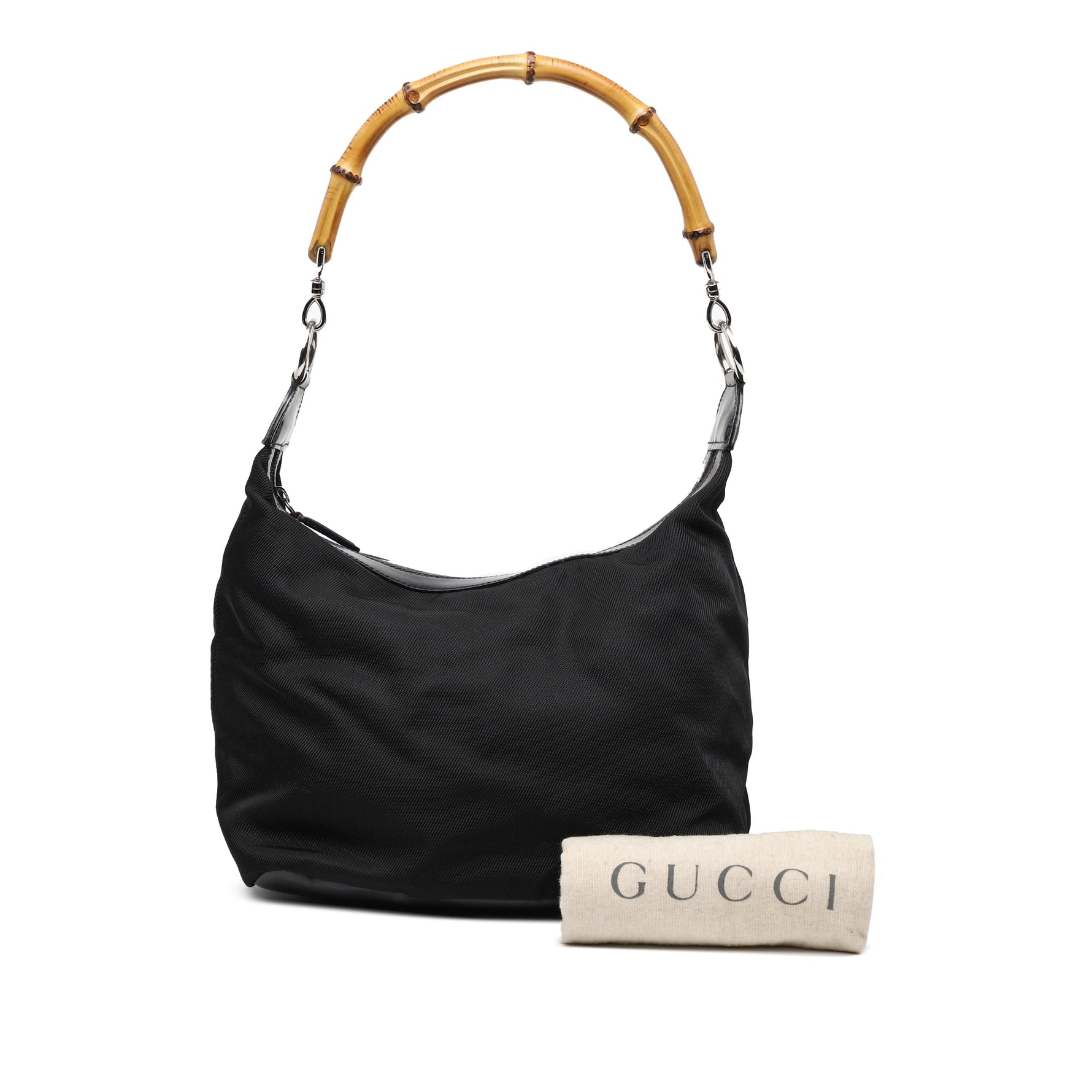 The Gucci Bamboo Shoulder Bag is one of the House’s most enduring icons — a refined blend of minimalist design and artisanal heritage. This vintage version is crafted in black nylon with leather trims, finished with the signature curved bamboo handle, individually shaped and polished by Italian artisans using traditional techniques introduced in the 1940s.