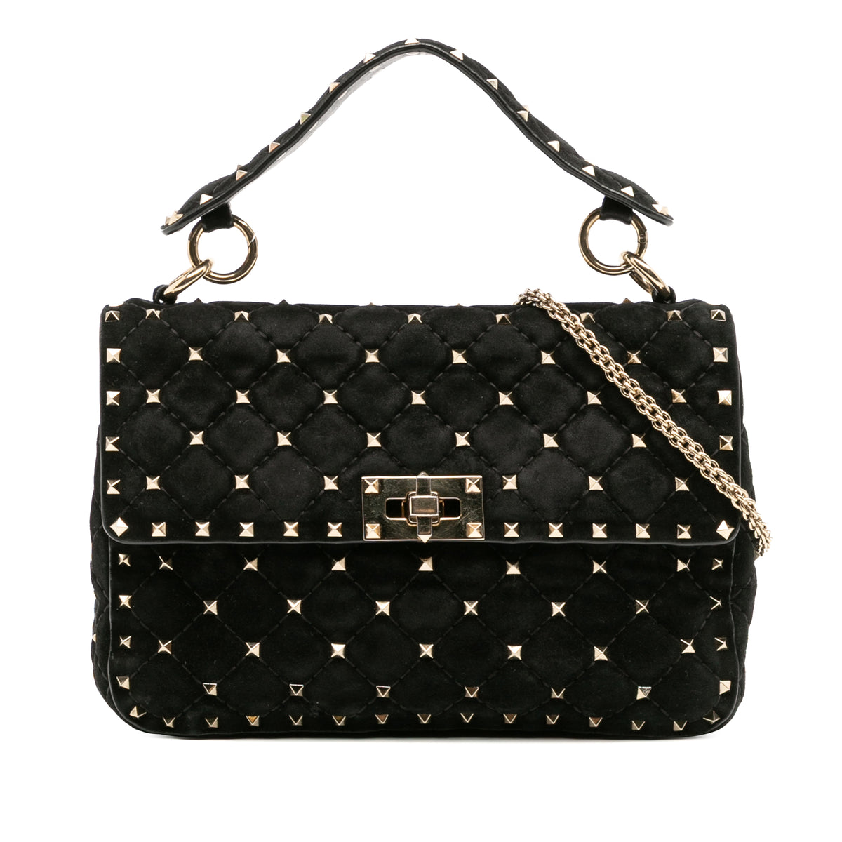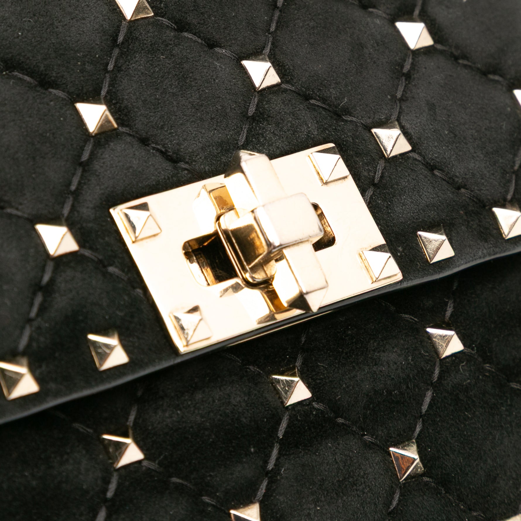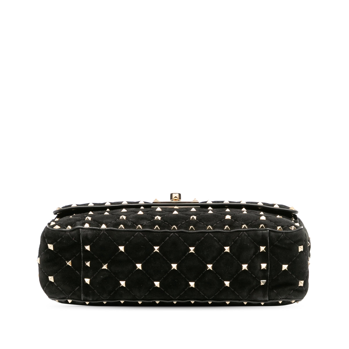 The Valentino Garavani Rockstud Spike Bag is a modern icon — a quilted flap bag crafted in plush black suede and finished with the House’s signature pyramid studs in gold-tone metal. Each stud is meticulously applied to enhance the soft, padded quilting, creating a contrast of texture and attitude that feels unmistakably Valentino.