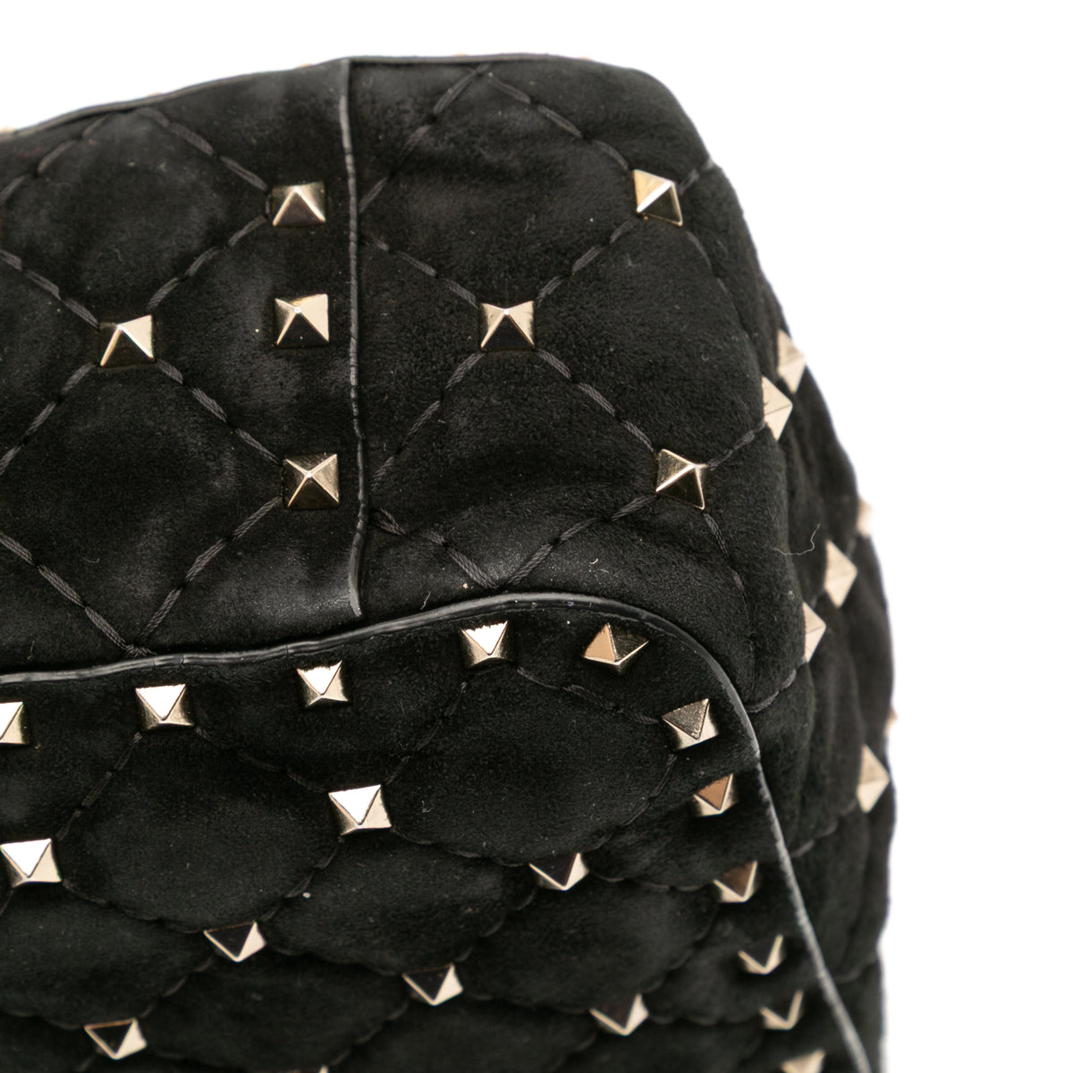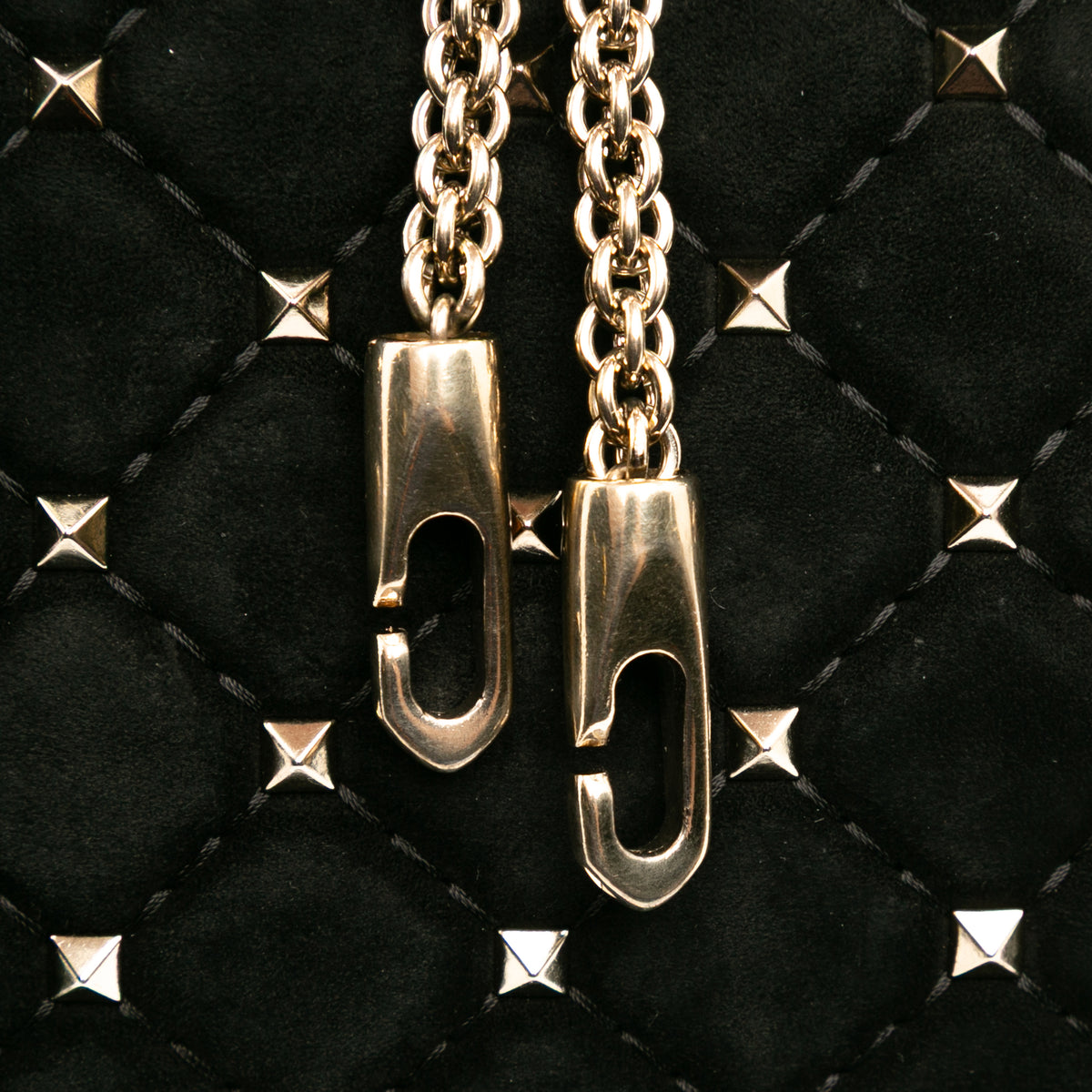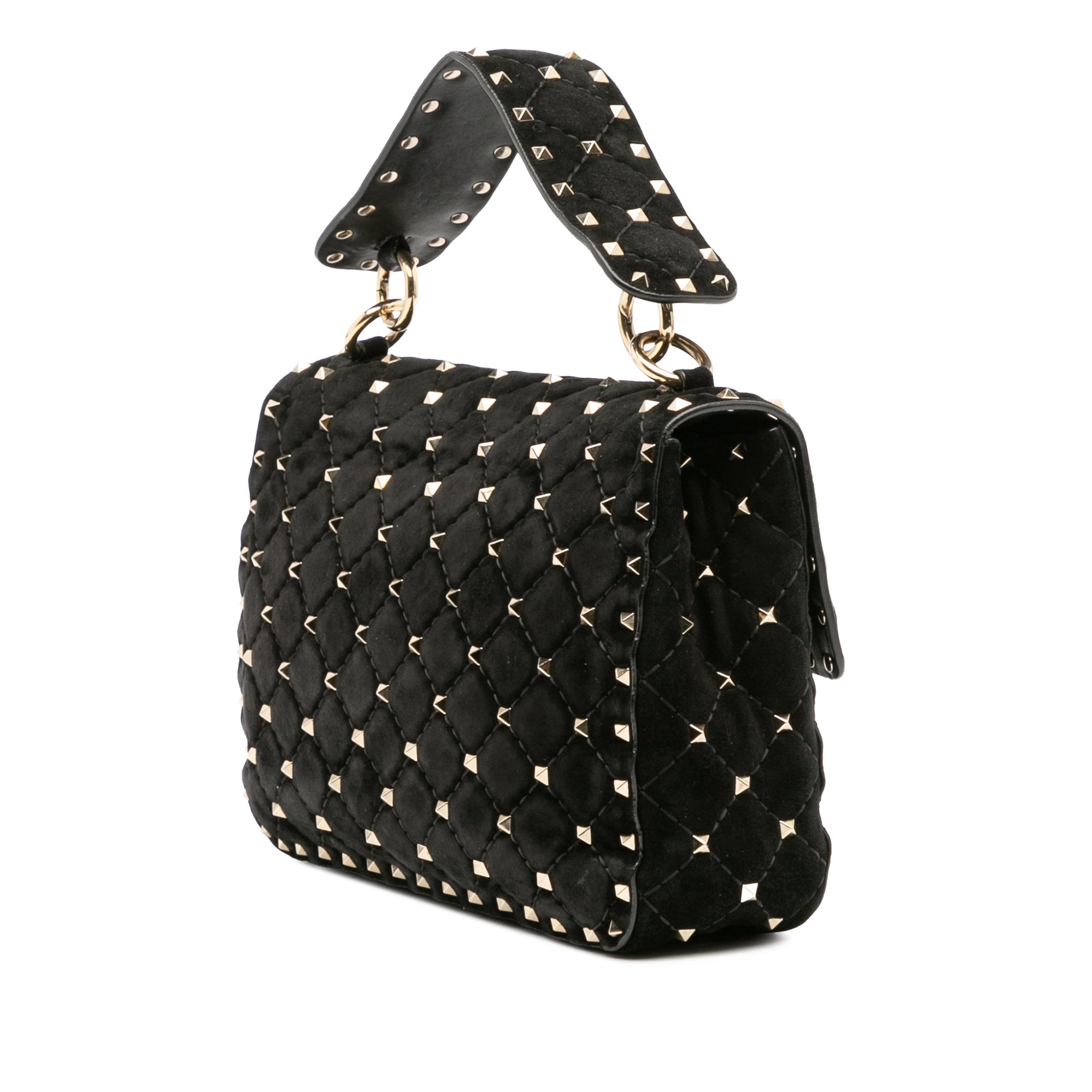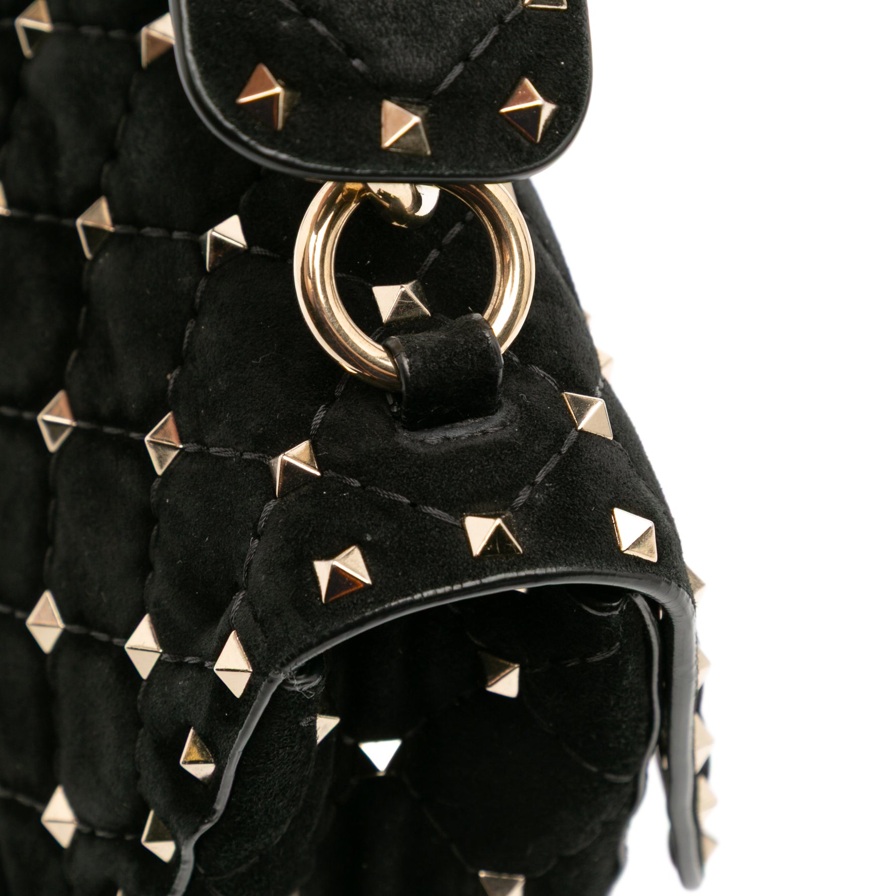 The Valentino Garavani Rockstud Spike Bag is a modern icon — a quilted flap bag crafted in plush black suede and finished with the House’s signature pyramid studs in gold-tone metal. Each stud is meticulously applied to enhance the soft, padded quilting, creating a contrast of texture and attitude that feels unmistakably Valentino.